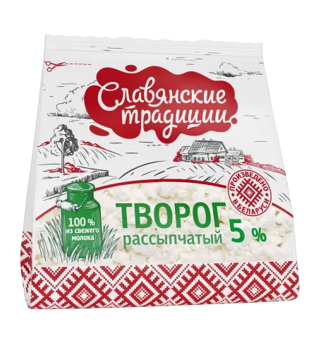 Рассыпчатый творог «Славянские традиции» обладает натуральным кисломолочным вкусом, а рассыпчатая консистенция напоминает деревенский творог. Рассыпчатый творог является самым диетическим и легкоусвояемым видом творога. Удобная многоразовая застёжка сохраняет свежесть и качество продукта.